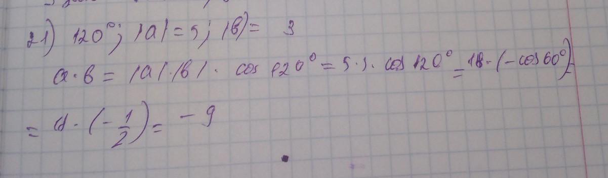 Вектори a і b утворюють кут 120 градусів; модуль |А| = 5, а модуль |В| = 3. Чому дорівнює скалярний добуток векторів А і В