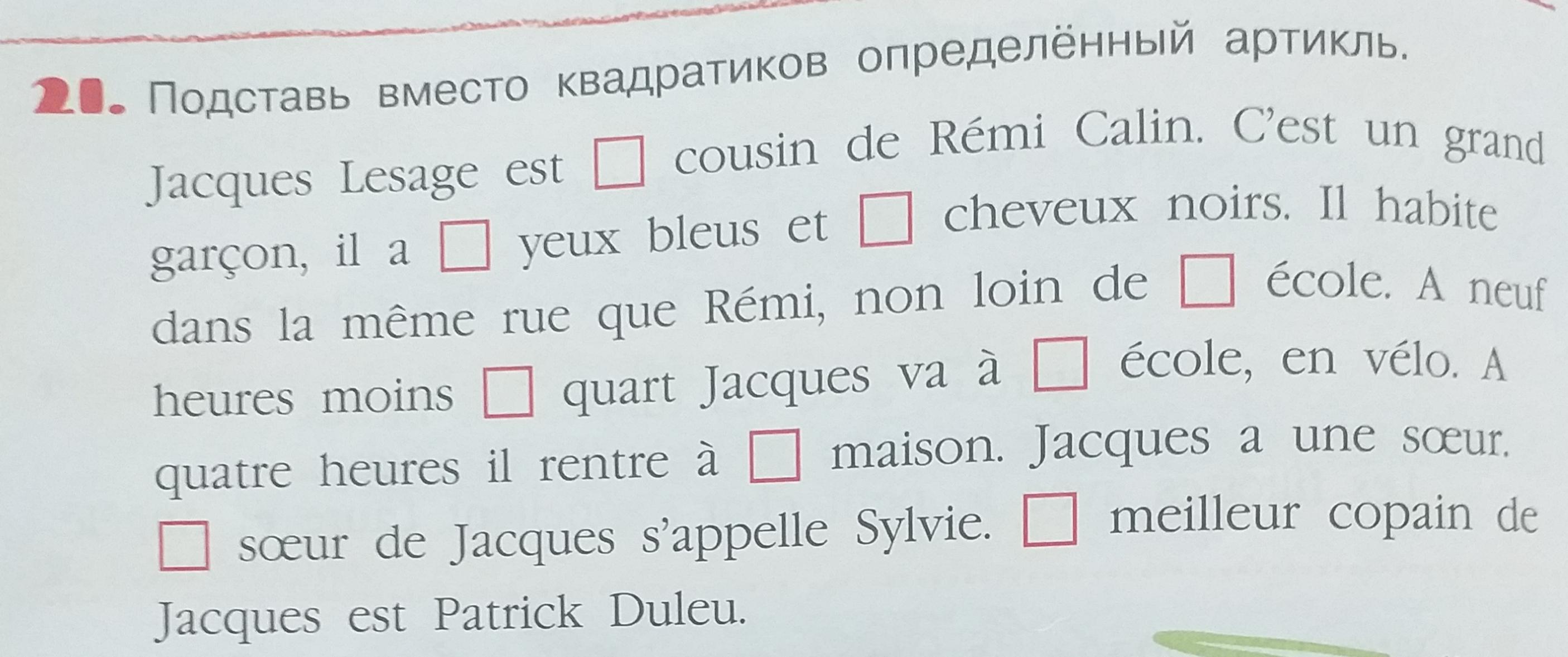 Le cousin, les yeux, les cheveux, de l’école, le quart, à l’école, à la maison, la sœur, le meuilleur