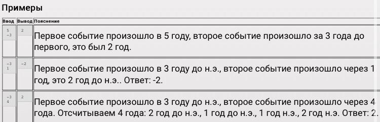 При этом года с номером 0 не существует, то есть нумерация лет выглядит так: ..., −3, −2, −1, 1, 2, 3, ... В летописях написано, что какое-то событие произошло в году номер A, а другое событие произошло спустя n лет после первого события (или за n лет до первого события).