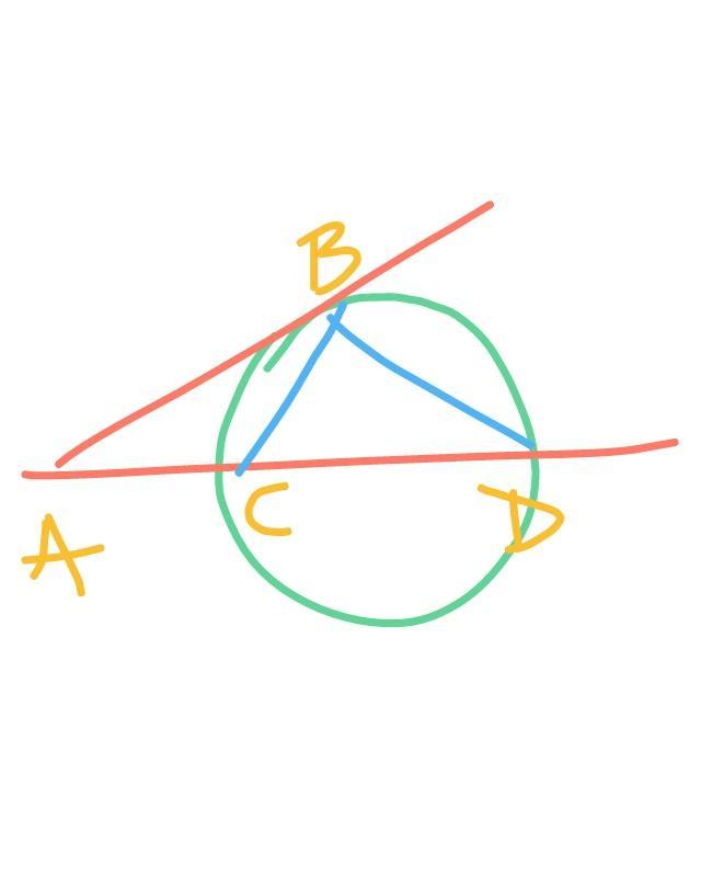Угол между касательной и хордой равен половине дуги, заключенной внутри этого угла, значит