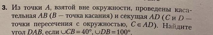 ∠DAB = 1/2 (∪DB - ∪CB) = 1/2 (100° - 40°) = 1/2 · 60° = 30°