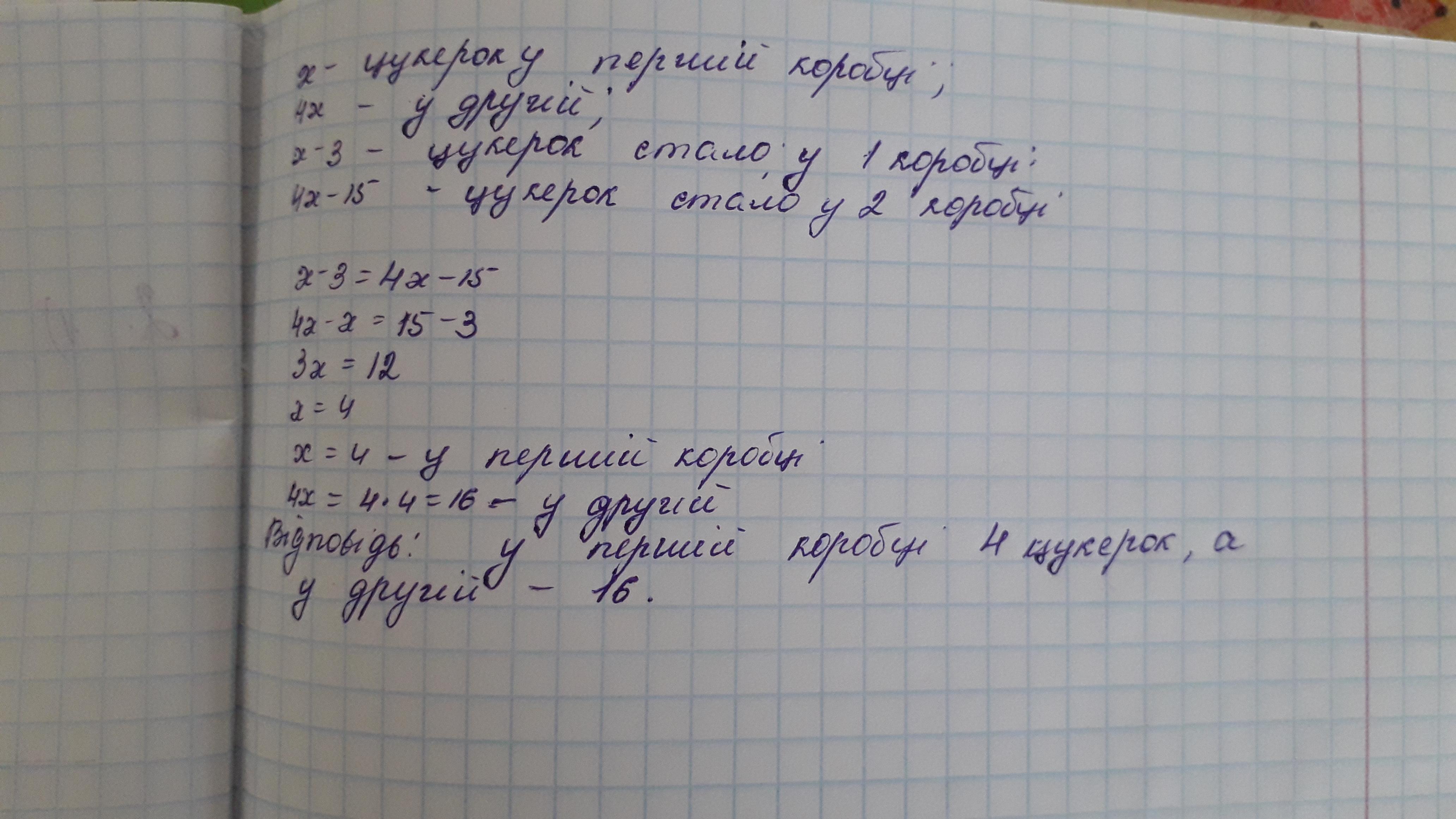 Прошууууу в одній коробці було в 4 рази менше цукерок ніж у другій після того як з першої коробки взяли 3 цукерки а з другої 15 цукерок в обох коробках цукерок стало порівну скільки цукерок було в першій коробці спочатку