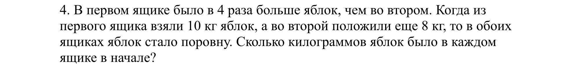 За х возьмем количество яблок во втором ящике, тогда количество яблок в первом ящике будет равно 4х