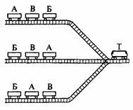 Машинист тепловоза (Т) может за один раз прицепить к тепловозу один или несколько вагонов с какого-нибудь пути, передвинуть их на правый путь, после чего передвинуть их на любой левый путь. Например, если тепловоз заберет 2 вагона с пути номер 3 на путь номер 1, то после такого действия распределение вагонов по путям будет таким.