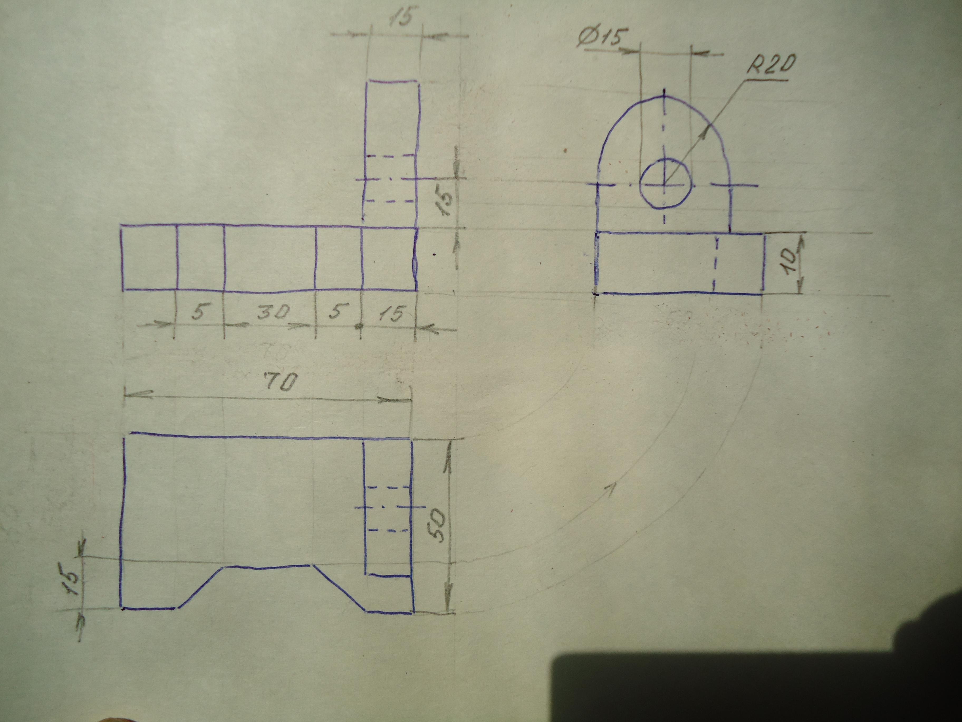 На чертеже нет размера по длине для верхней части детали. Можно предположить, что она равна 15 мм.