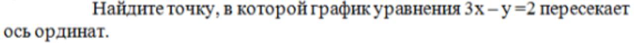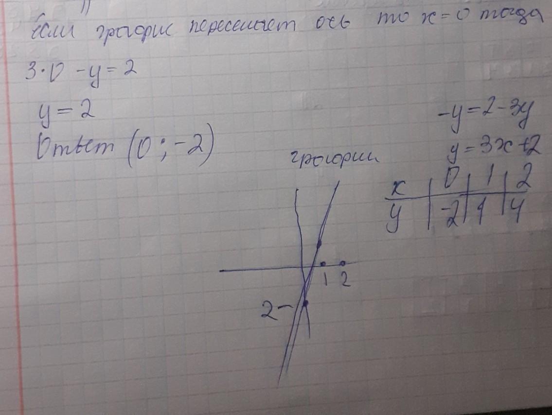 Если график пересекает ось ординат то х=0,тогда 3•0-у=2. у=-2. ответ :это точка с координатами (0;-2)
