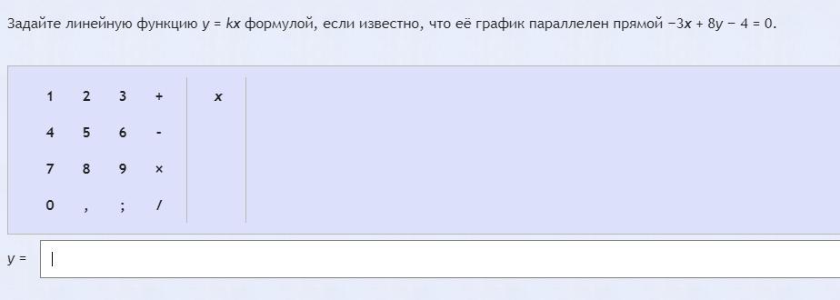 Задайте линейную функцию y = kx формулой, если известно, что её график параллелен прямой –3x + 8y – 4 = 0.