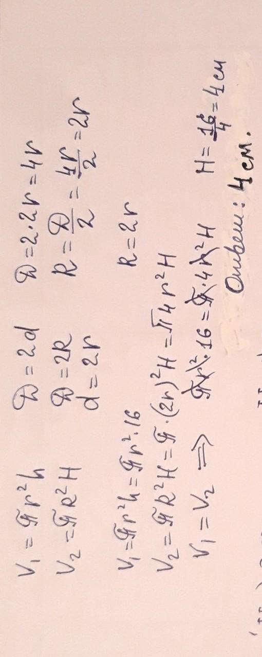Объём жидкости у нас неизменный, значит мы их приравниваем и решаем уравнение, получается