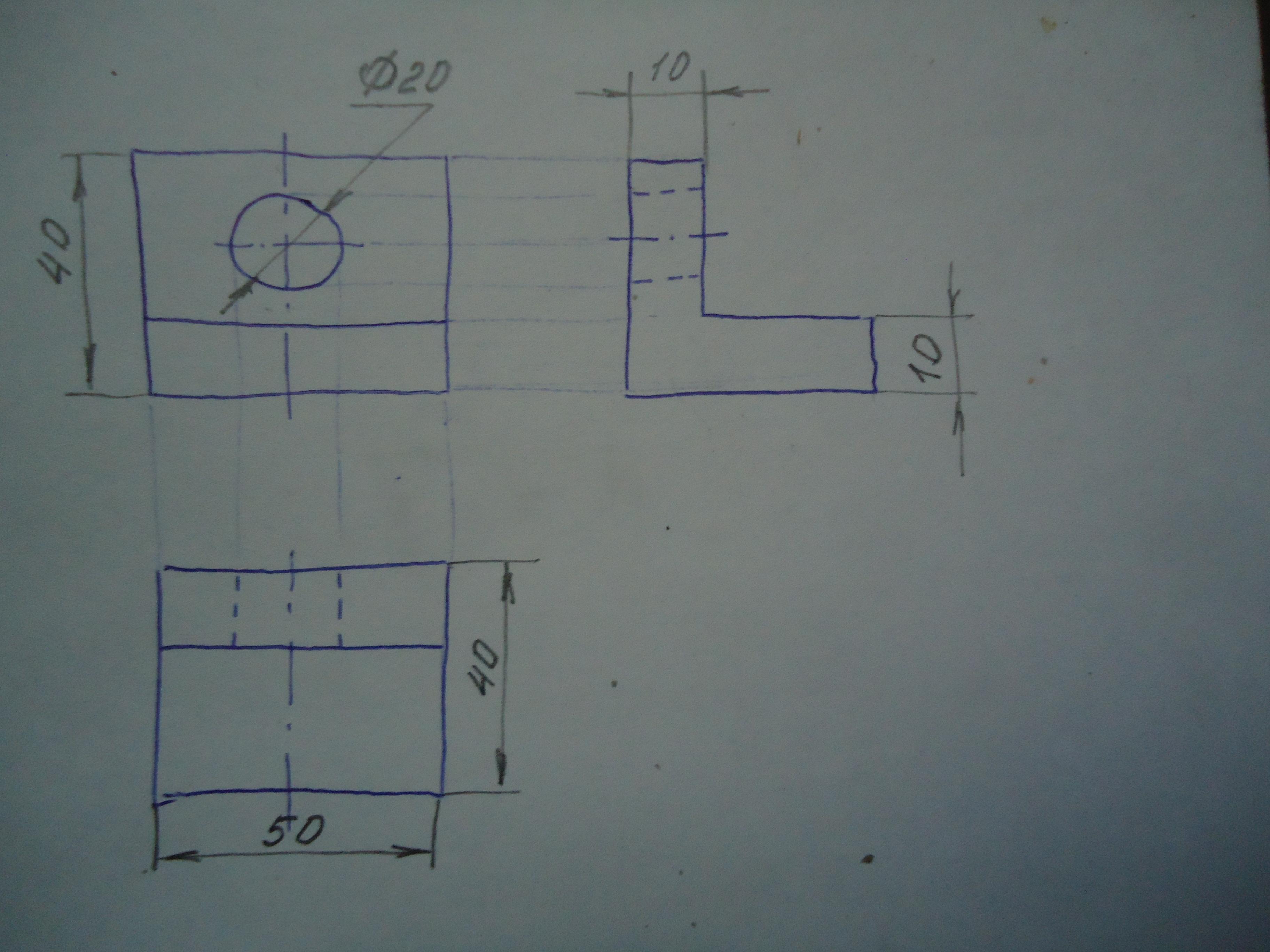 Эскиз чертежа из трёх видов детали выполняется на клетчатой бумаге, от руки и с сохранение пропорций на глаз, а размеры проставляются действительные. Т.к. на изображении нет размеров, я предложила свои размеры.