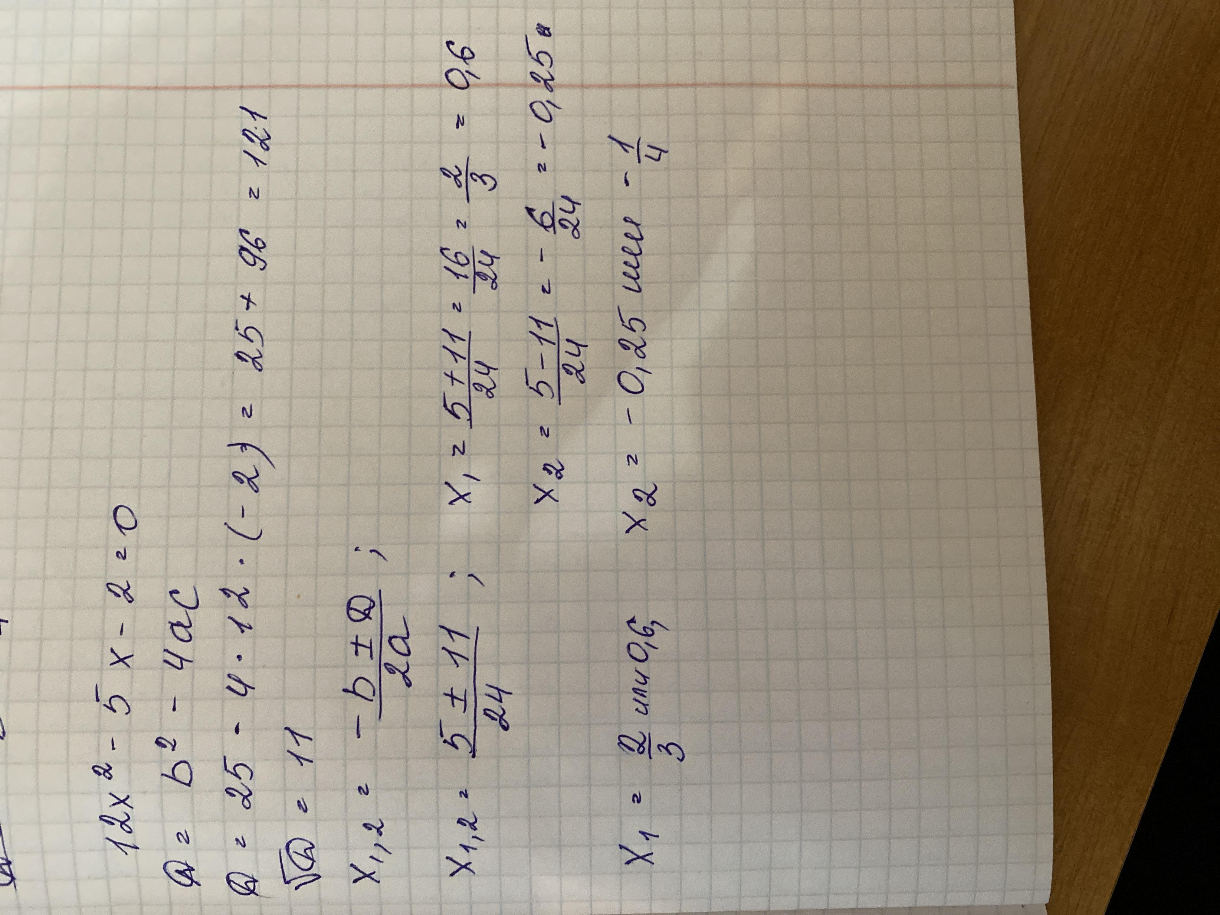x1 = \frac{ - b - \sqrt{} d}{2a} = \frac{5 - 11}{24} = - \frac{1}{4} \\ x2 = \frac{ - b + \sqrt{} d}{2a} = \frac{5 + 11}{24} = \frac{2}{3}