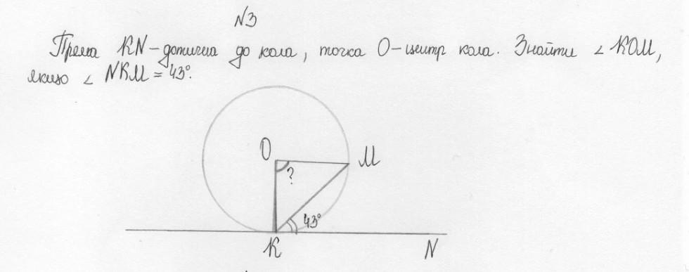 90-43=47* ,тоді кут MKO=куту OMK=47*