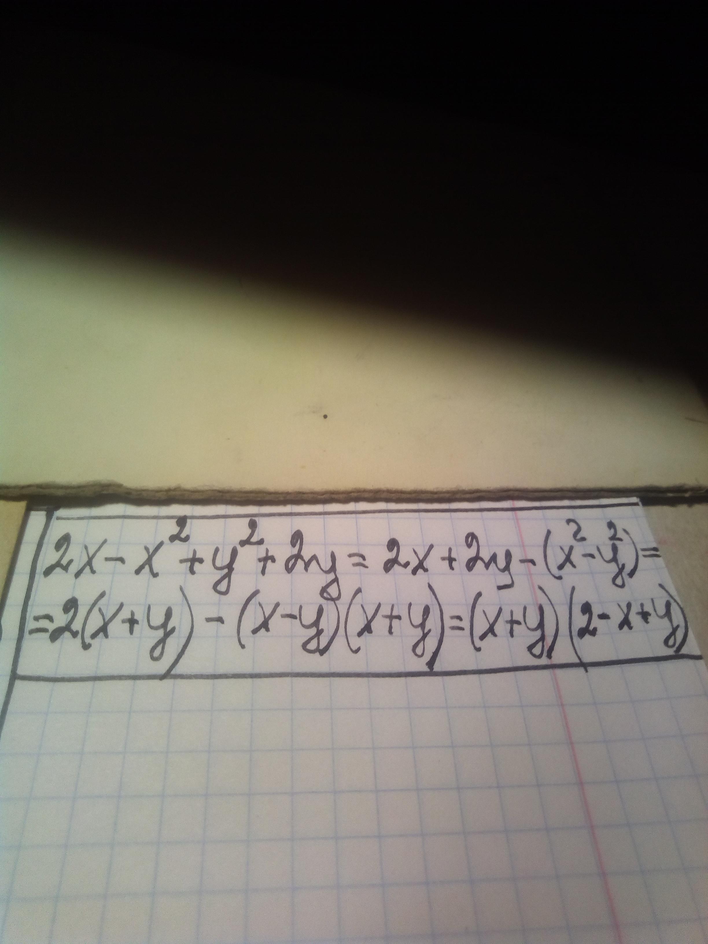 2х-х2+y2+2y=(2х-2y)+(у²-х²)=2(у+х)+(у-х)(у+х)=(у+х)(2+у-х)