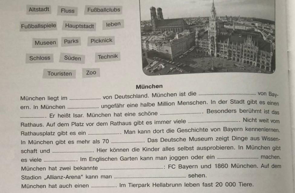 Мюнхен находится на юге Германии. Мюнхен столица Баварии. В Мюнхене живет около пол миллиона человек. В Мюнхене есть река. Она называется Изар. В Мюнхене есть красивый старый город. Особенно знаменит он ратушей. Перед ратушей всегда много туристов. Не далеко от ратуши есть замок. Там можно познакомится з историей Баварии. В Мюнхене есть больше 70 музеев. Музей Германии представляет найчные и технические экспонаты. Тут могут дети все попробовать. В Мюнхене есть много парков. В английском парке можно занятся пробежкой или пикник устроить. В Мюнхене есть 2 знаменитых футбольных клуба: Бавария Мюнхен и 1860 Мюнхен. На альянс арене можно смотреть футбольные матчи. В Мюнхене есть также зоопарк. В парке животных Хеллабрунн живут почти 20 000 животных.