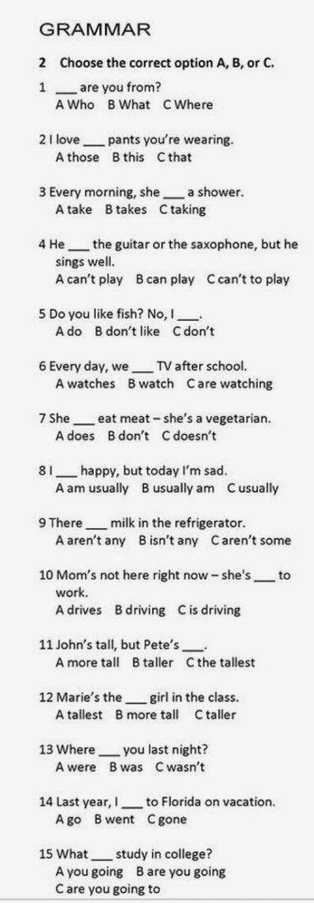 1) c 2) b 3) b 4) a 5) b 6) b 7 ) c 8) a 9) a 10 ) c 11) a 12) a 13) a 14 ) b 15)c