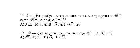 11. R=AB/(2*sin∠C)=AB/(2*(√2/2)=AB/√2. AB не понятно чему равно?