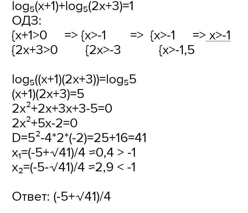 ОДЗ: х-1>0 Х>1 Х принадлежит (1,+бесконечность). 2х-3>0 2х>3 Х>3/2 Х принадлежит (3/2,+бесконечность). Log5(x-1)=log5(2x-3) X-1=2x-3 -x=-2|:(-1) x=2 Ответ: 2