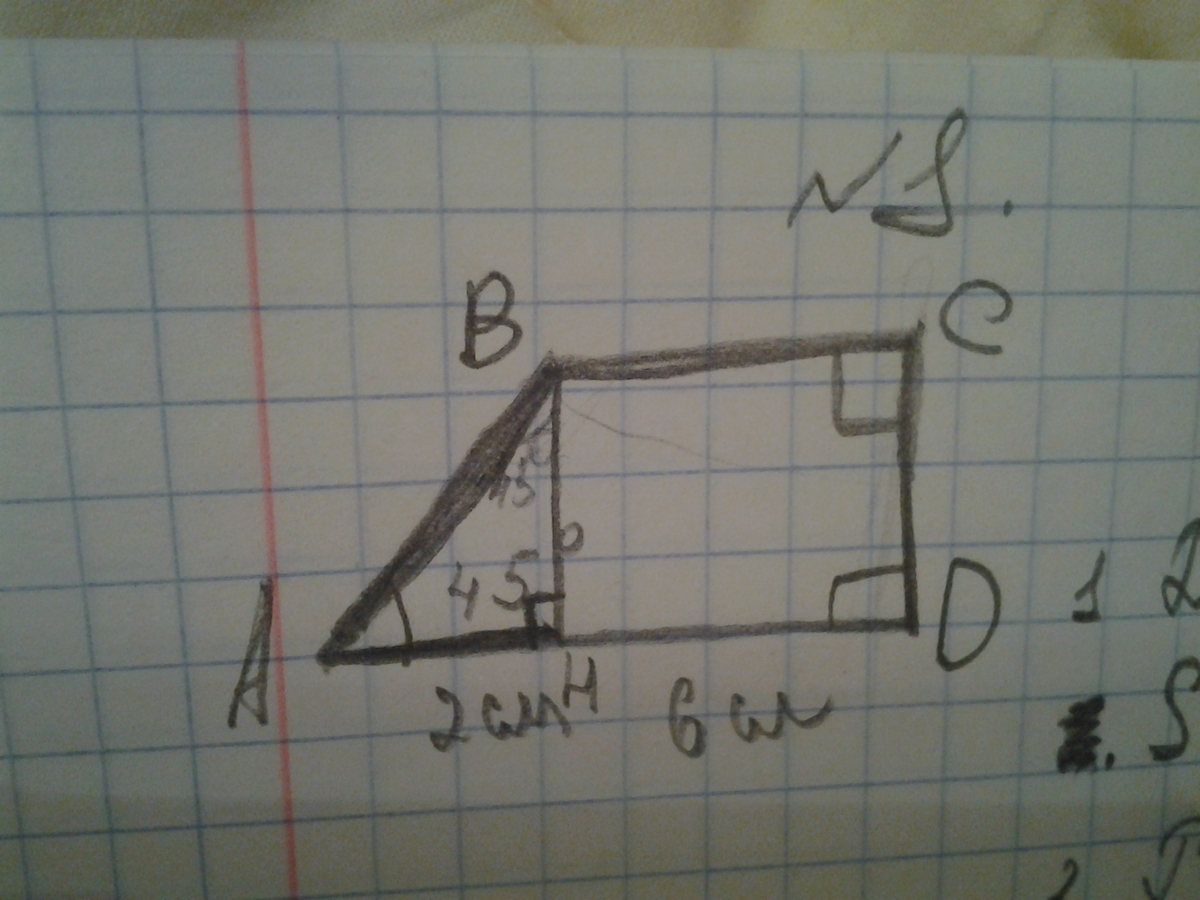 в прямоугольной трапеции острый угол равен 45 градусов а высота проведенная из вершины тупого угла делит большее основание на отрезки 2 и 6 считая от точки !найти площадь трапеции решть эту задачу