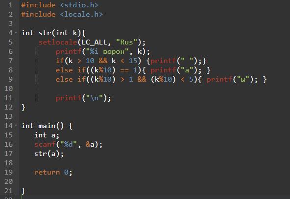 Дано число K (K<100). Напечатать фразу вида: 21 ворона, 30 ворон и т. д., в зави-симости от заданного значения K.