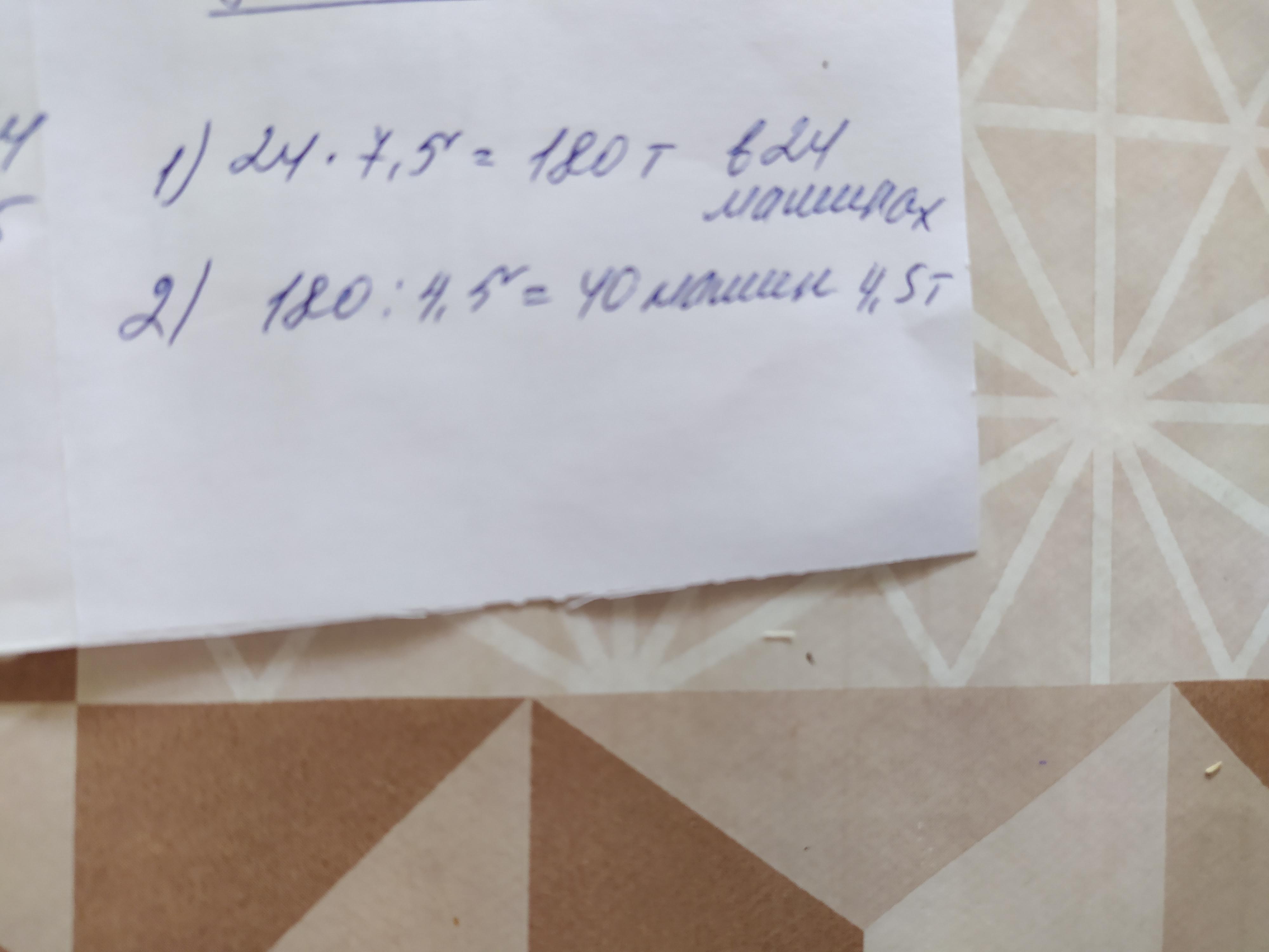 Для перевозки груза потребовалось 24 машины грузоподъёмностью 7,5 т. Сколько нужно машин грузоподъёмностью 4,5 т, чтобы перевезти тот же груз?