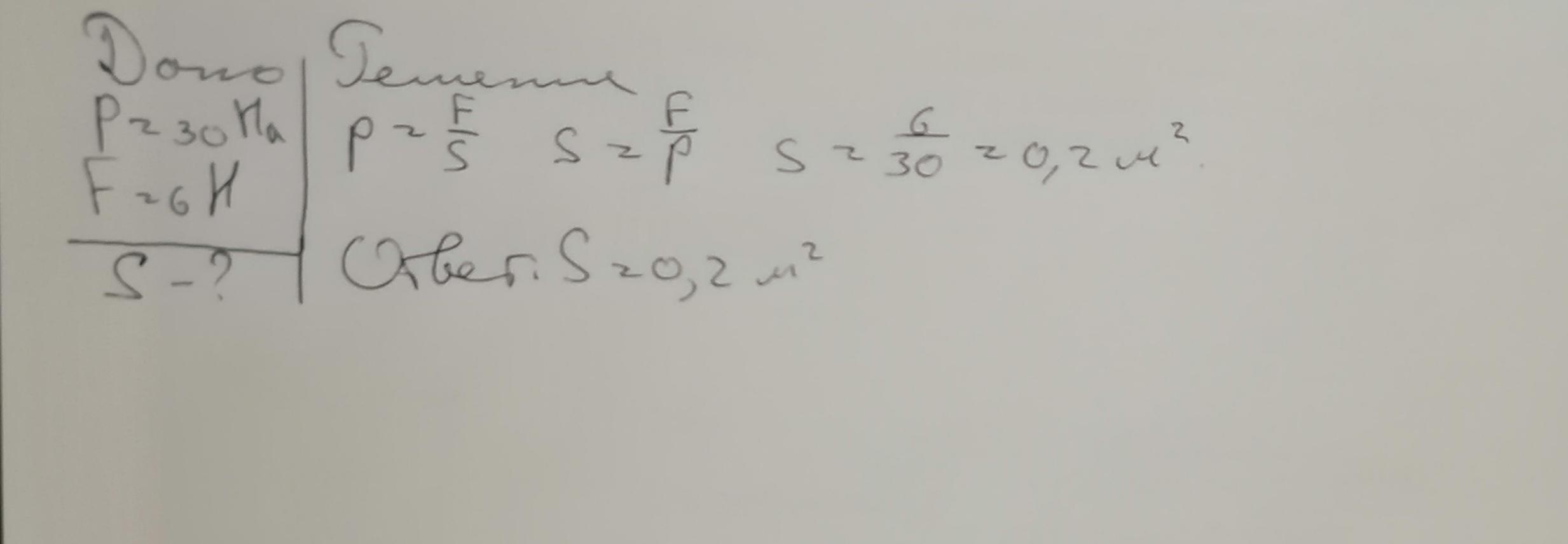 На крышку , закрывающую сосуд, газ оказывает давление в 30 Па,действуя на неё с силой 6Н .Какова площадь этой крышки. Решите задачу , дано , формула , решения.