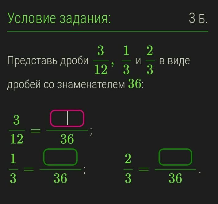 Представь дроби 3/12,1/3 и 2/3 в виде дробей со знаменателем 36