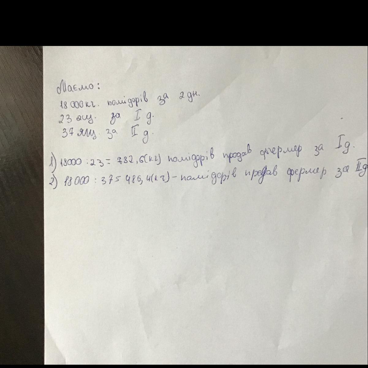 За два дні фермер продав 18000 кг.помідорів.За перший день він продав 23 ящ.,за другий-37.Скільки кг.помідорів продав фермер першого ідругого дня окремо?