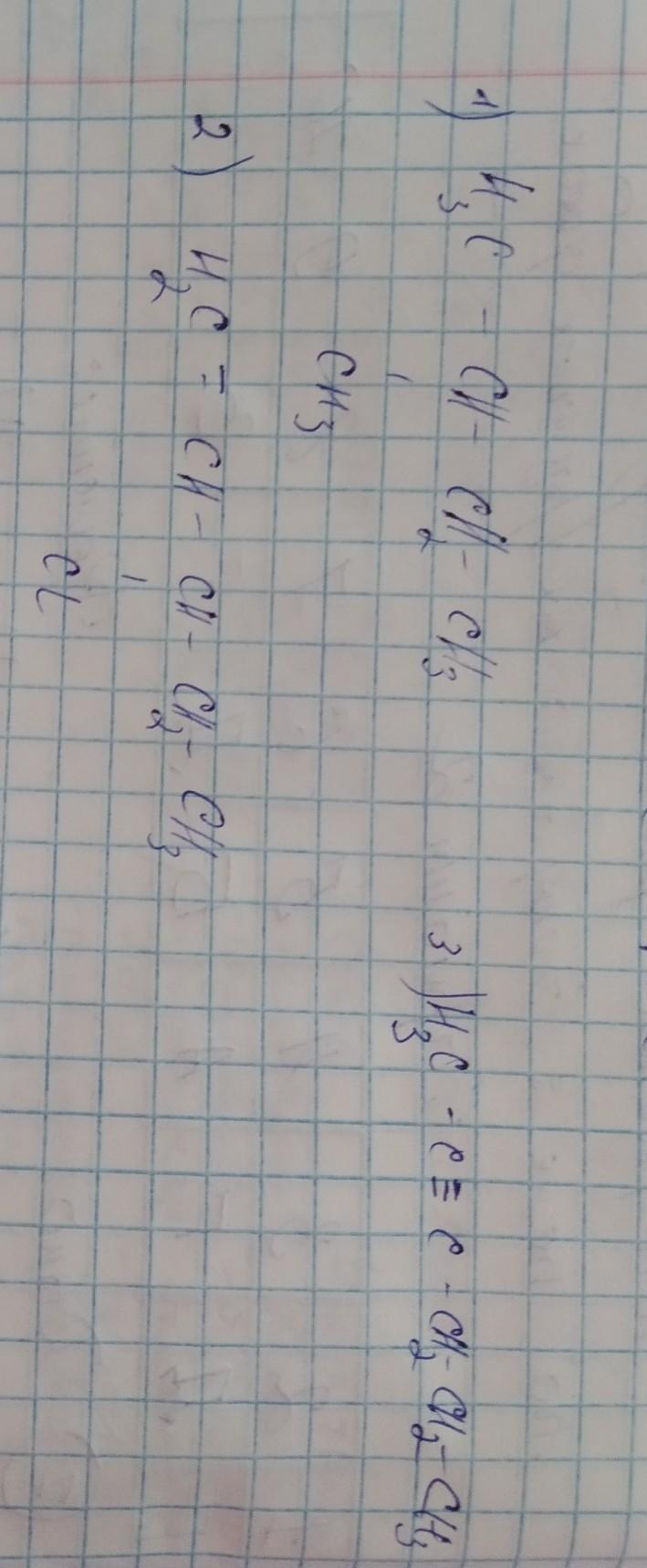 Структурные формулы. Письменно попробовать написать структурные формулы следующих веществ: 2-метилбутан, 3-хлор-пентен-1, гексин-2. Помогите прошу буду очень благодарен даю 40баллов !!!