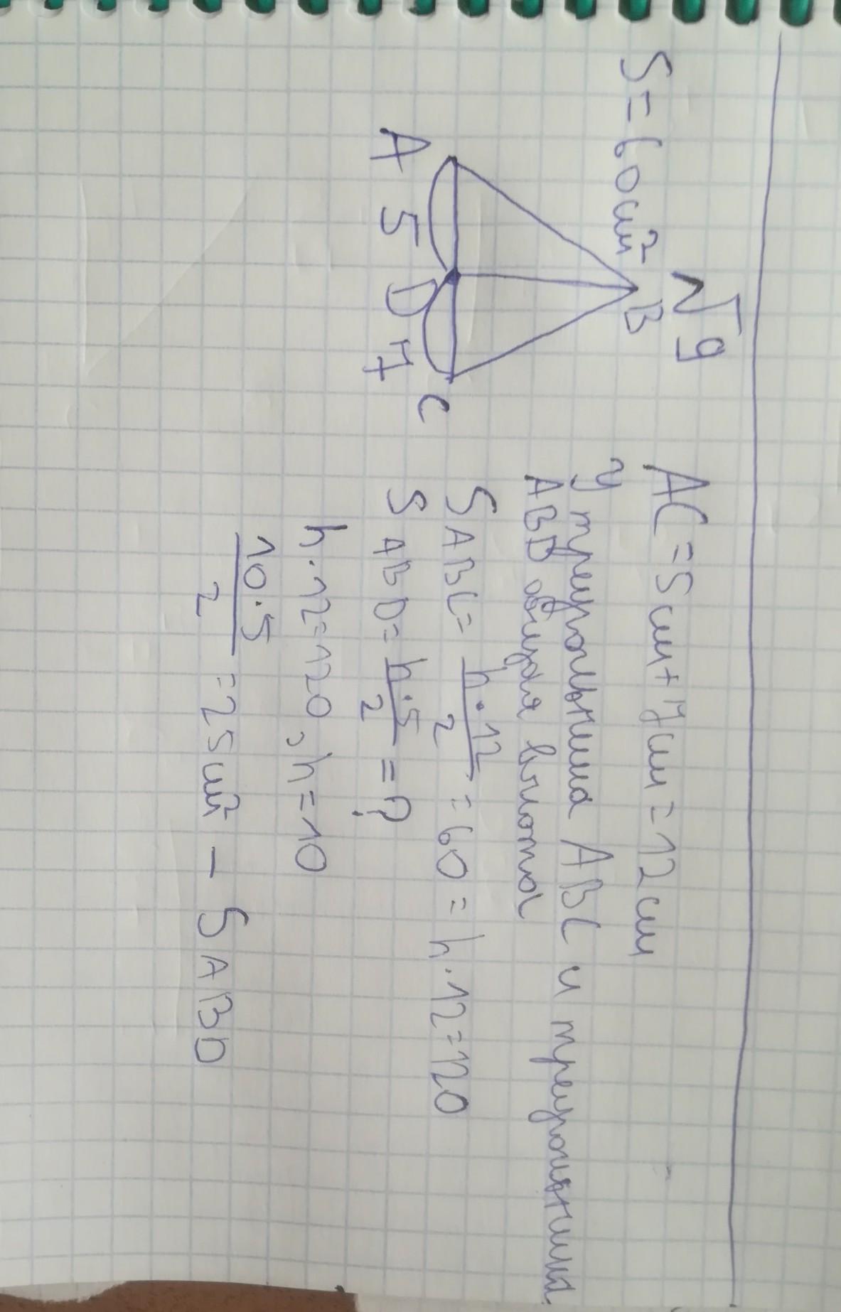 9. На стороне AC треугольника ABC отмечена точка D так, что AD = 5, DC = 7. Площадь треугольника ABC равна 60 см². Найдите площадь треугольника ABD