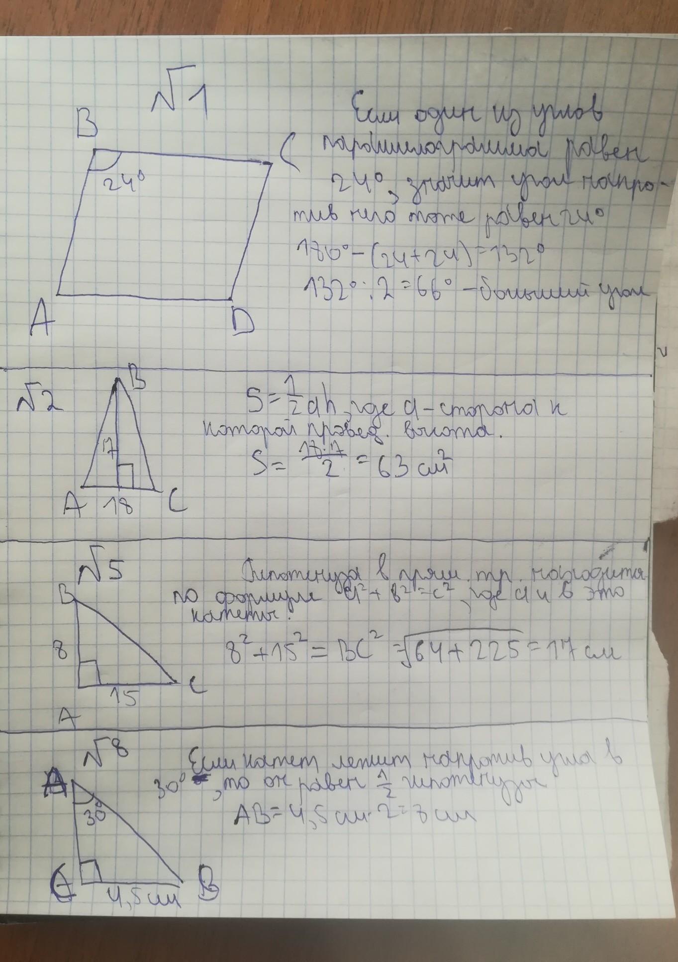 1. Один из углов параллелограмма равен 24°. Найти больший угол параллелограмма.