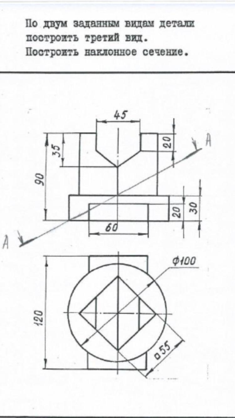По двум заданным видам построить третий вид. Построить наклонное сечение. (секущая плоскость АА)