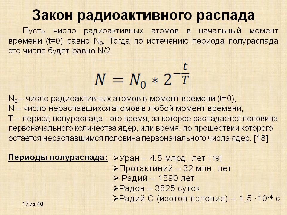Закон радиоактивного распада - физический закон, описывающий зависимость интенсивности радиоактивного распада от времени и от количества радиоактивных атомов в образце. Был открыт Фредериком Содди и Эрнестом Резерфордом, каждый из которых впоследствии был награждён Нобелевской премией.