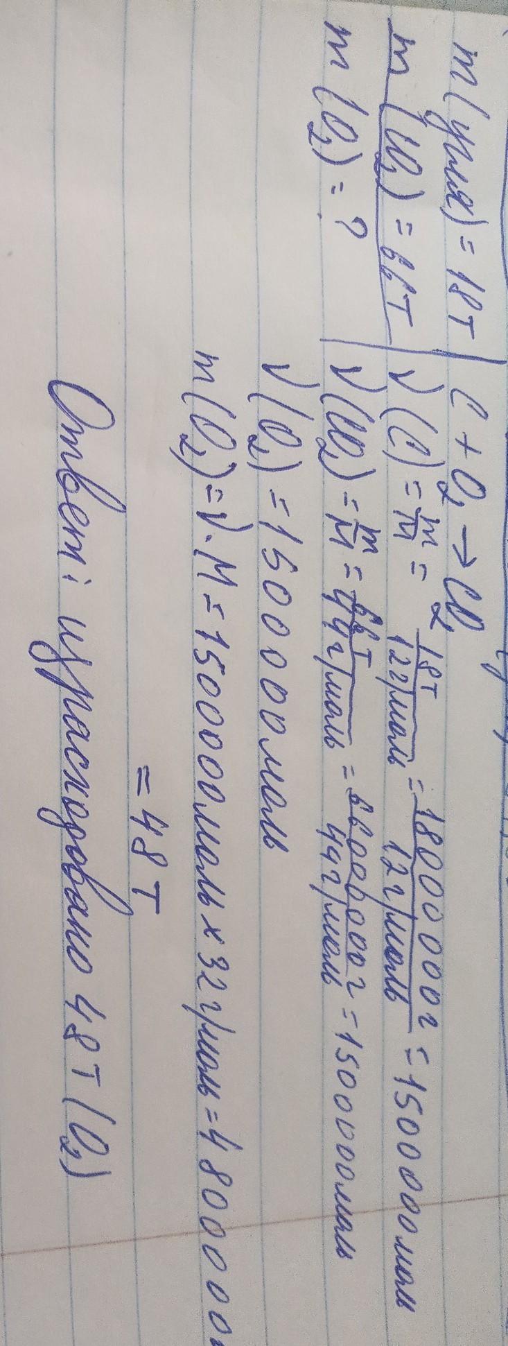 На сжигание 18 тонн угля (С) потребовался кислород (О2), при этом получили 66 тонны углекислого газа (СО2). Какая масса кислорода была израсходована?