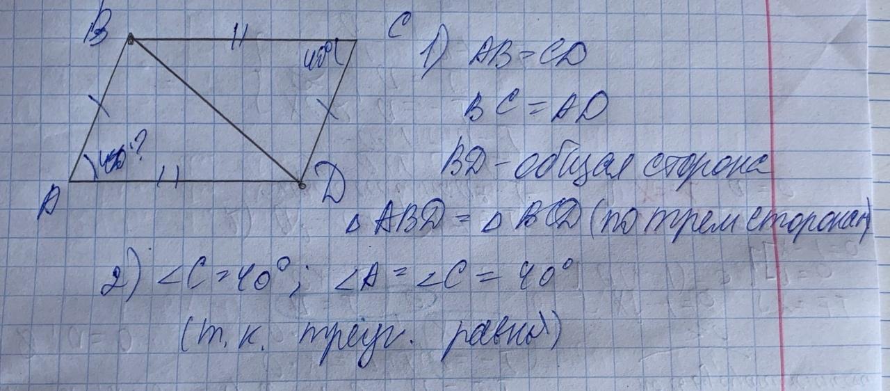 Якщо АВ=СД, ВС=АД. ВД -спільна. Отже трикутники рівні за трьома сторонами. В рівних трикутниках відповідні кути рівні. Отже кут А=40 градусів