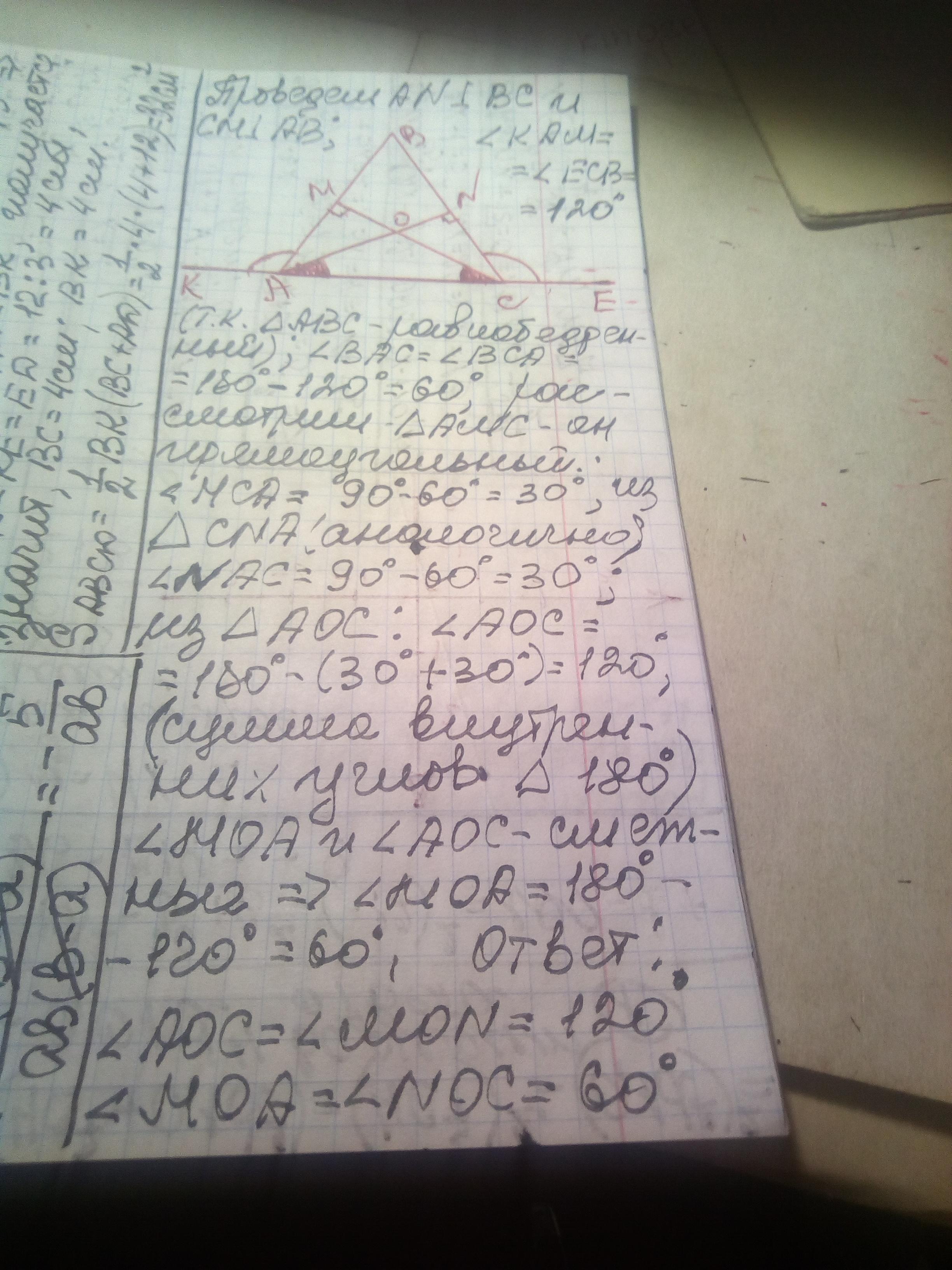 у рівнобедреному трикутника зовнішній кут при основі дорівнює 120°. Знайдіть кути, які утворилися в точці перетену висот, проведених , з вершин кутів при основі. Помогите