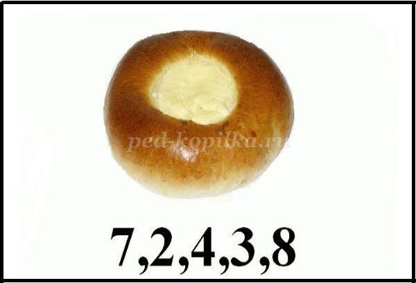 Картинка там где вотрушка..Цифры под картинкой указывают на то, что из данного слова нужно взять буквы, стоящие на местах под номерами 7,2,4,3,8 и составить их в том порядке, в котором расположены цифры. В слове ватрушка нужно взять буквы 7-К, 2-А, 4-Р, 3-Т, 8-А. Можно прочитать слово.