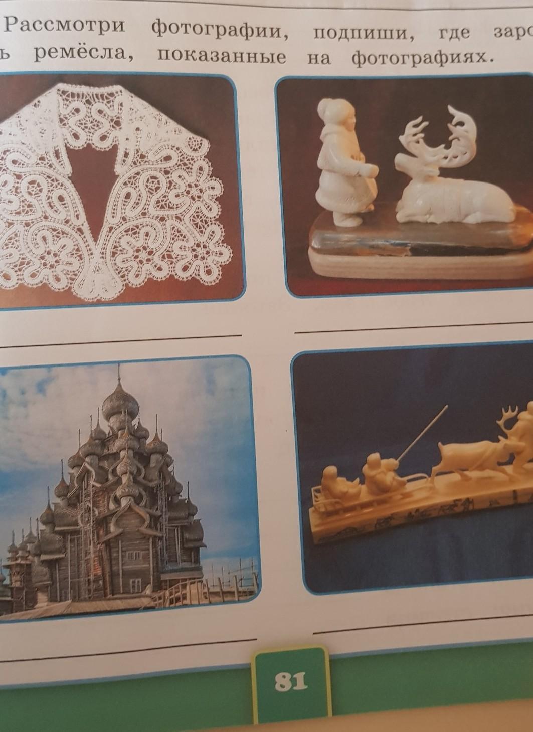 Объяснение: 1- кружева на коклюшках 2- резьба из кости 3- храм из дерева без гвоздей 4 - резьба из моржовой кости
