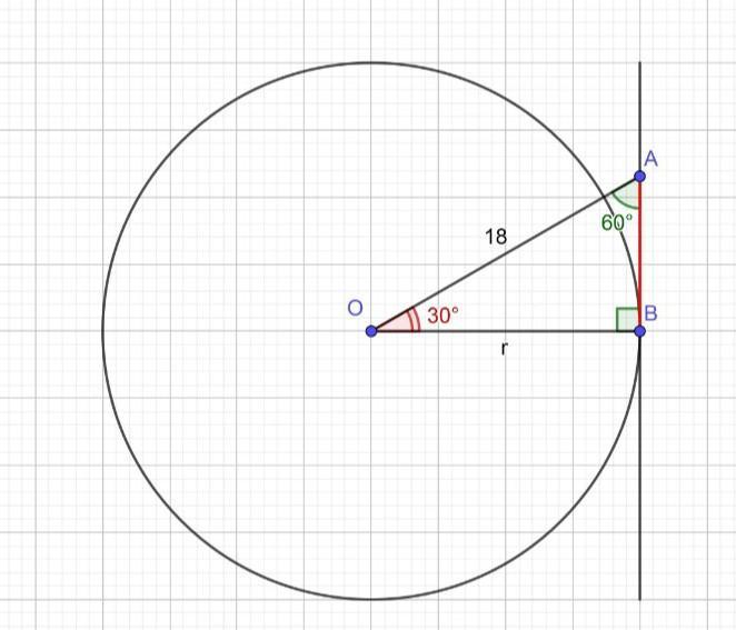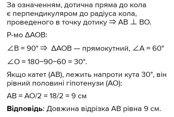 До кола з центром О проведено дотичну АВ, де В–точка дотику. Знайдіть довжину відрізка АВ, якщо АО=18 см, а кут ВАО =60 градусів
