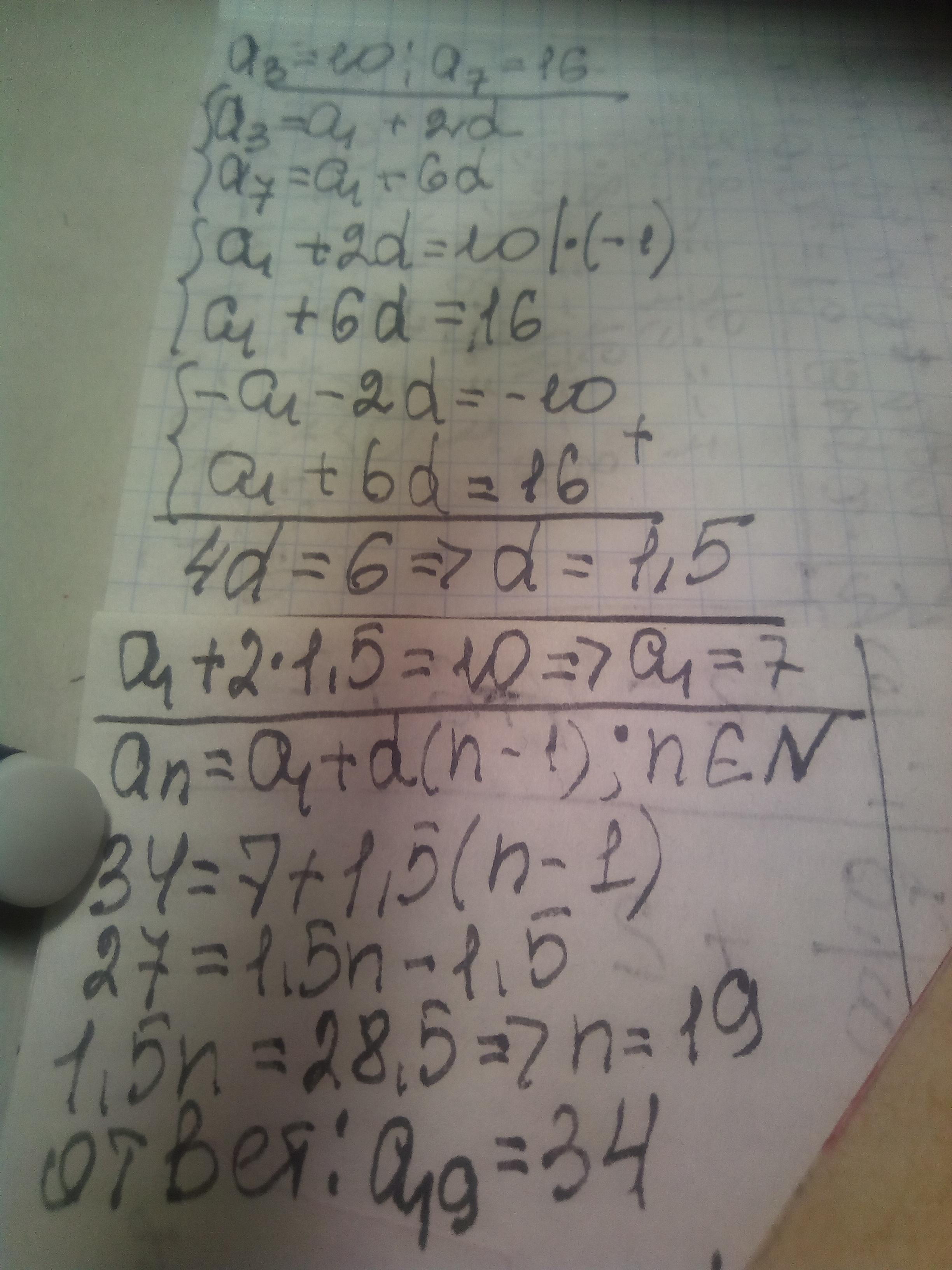 В арифметичній прогресії (а) відомо а3=10,а7=16. Знайти номер члена арифметичної прогресії, що дорівнює 34.
