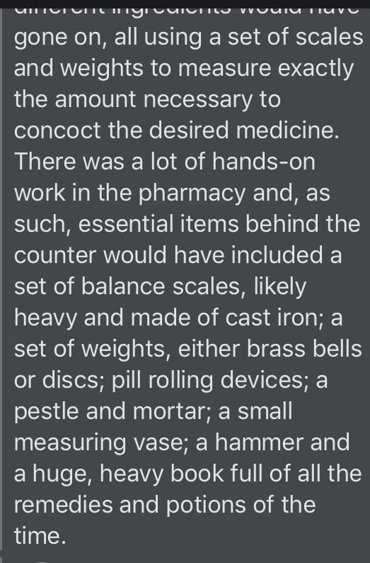 Аптеки викторианской эпохи Более всего, чем любые врачи в ранней викторианской Англии, аптека была тем, что впервые принесло пользу населению. Это было значительным изменением для общества и позволило обычному человеку получить доступ к лекарствам и средствам от болезни. Появление аптеки на главной улице было революционным для ранних викторианцев. В отличие от аптек 21-го века, которые мы посещаем сегодня, которые полны расфасованных таблеток, пакетиков, сиропов и спреев для лечения тысяч повседневных болезней, посещение викторианской аптеки было бы гораздо более индивидуальным делом. Стены, вероятно, заполненные рядами деревянных стеллажей, вмещали бы целое множество бутылок и коробок, каждая из которых содержала жидкости и порошки всех видов цветов, все тщательно маркированные их латинскими названиями. Травы, растения и даже некоторые животные тоже могли бы храниться в изобилии за прилавком, возможно, во множестве крошечных ящиков, все тщательно маркированных, готовых к тому, чтобы фармацевт или его ученик смешались. Действительно, особенно в ранние викторианские времена, было бы много смешивания и взвешивания различных ингредиентов, используя набор весов и весов для точного измерения количества, необходимого для приготовления желаемого лекарства. В аптеке было много практической работы, и, следовательно, предметы первой необходимости, стоящие за прилавком, включали бы в себя весы, вероятно тяжелые и сделанные из чугуна; набор гирь, либо медных колокольчиков, либо дисков; устройства для прокатки таблеток; пестик и ступка; маленькая мерная ваза; молоток и огромная, тяжелая книга, полная всех лекарств и зелий времени.