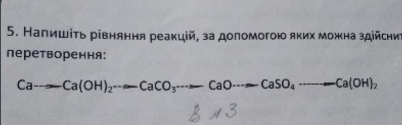 напишіть рівняння реакції, за допомогу яких можна здійснити перетворення : Ca->Ca(OH) 2->CaCO3->CaO->CaSO4->Ca(OH) 2