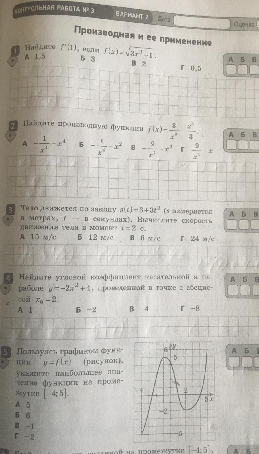 Пошаговое объяснение: 1) f'(x)= (√(3x²+1))' =6x/ √(3x²+1 ), f'(1)=6/4=1,5 Ответ:А 2) f(x) = 3/x³ - x³/3 ⇒ f'(x) = (3/x³ - x³/3)'=(3·x⁻³)'- 3x²/3= - 9x⁻⁻⁴/4 - x²= -9/x⁴ -x² (Ответ: В) 3) s(t)=3+3t², t=2 c скорость v(t)=s'(t)=6t ⇒ V(2)=6·2=12(м/c) Ответ: Б 4) у=-2х²+4, х₀=2 y'= -4x, k=y'(x₀)= -4·2=-8 Ответ:Г 5) Ответ: Б 6