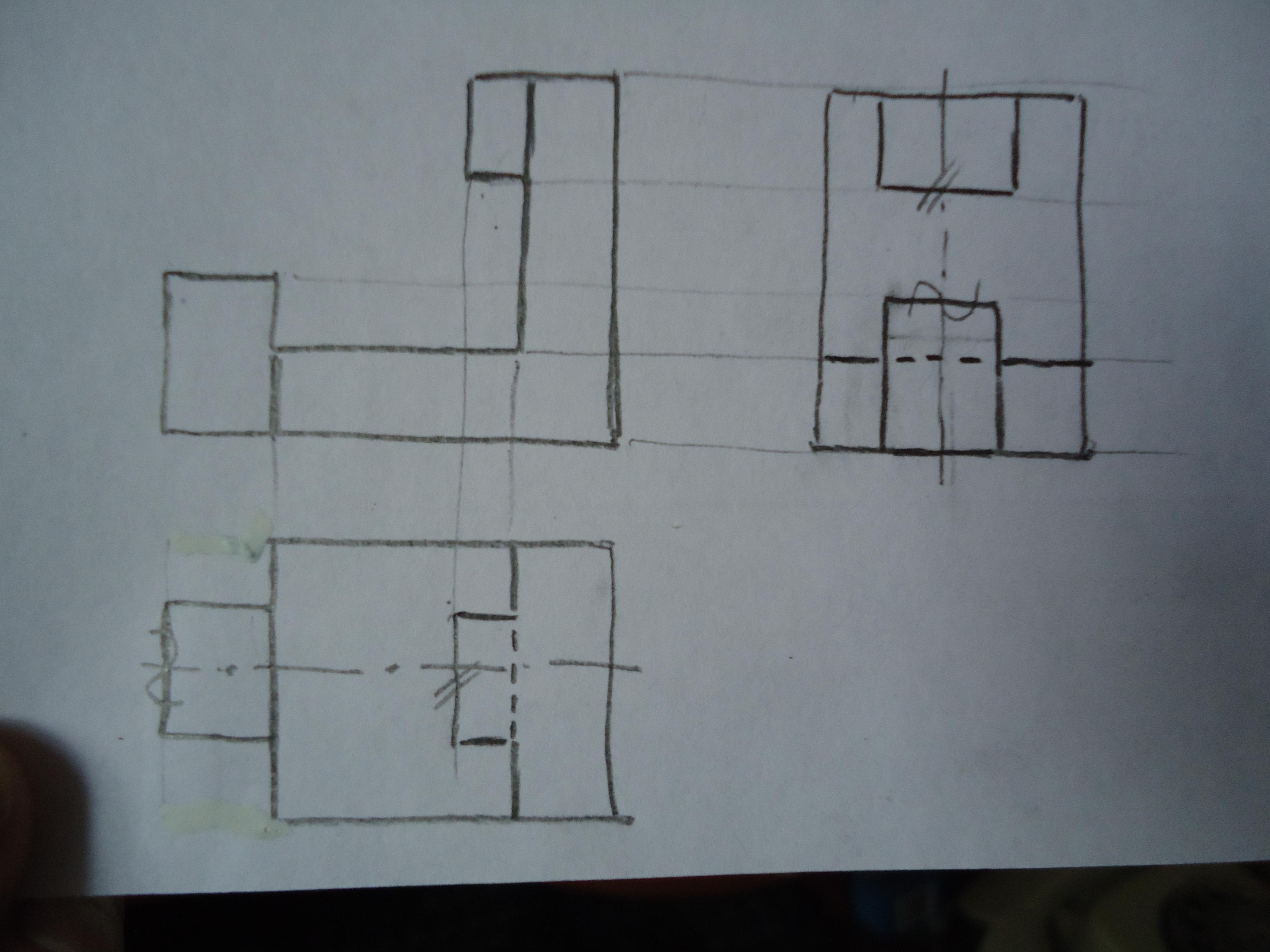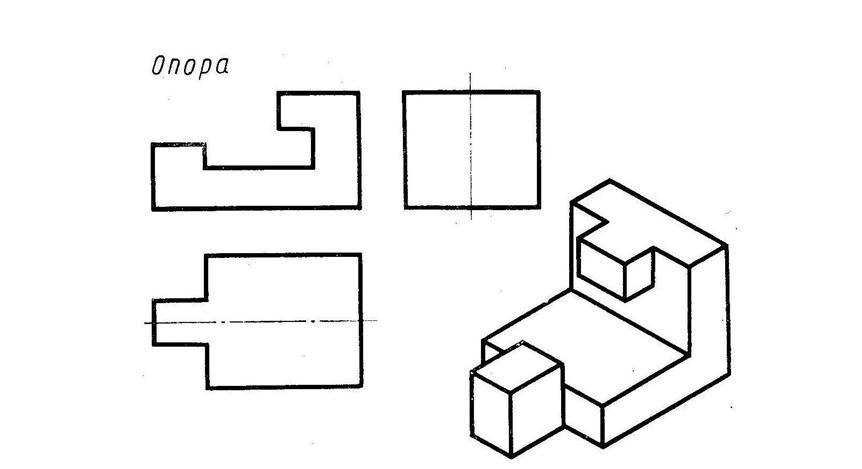 Сначала постройте недостающие линии на виде спереди и виде сверху. Затем нанесите линии на вид слева.