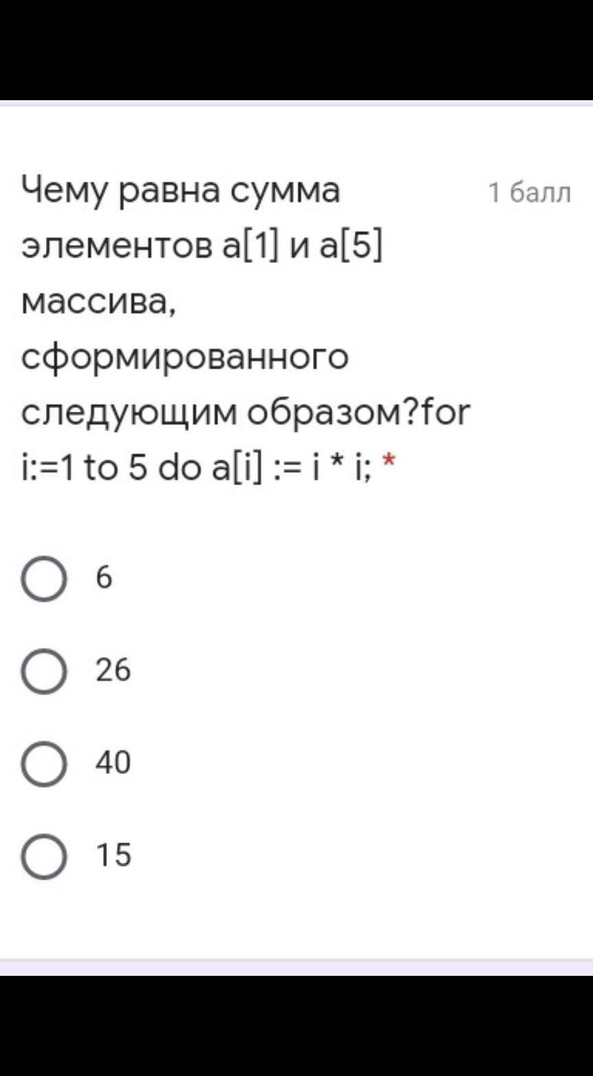 Чему равна сумма элементов а[1] и а[5] массива, сформированного следующим образом?for i:=1 to 5 do a[i]:= i* i; ответьте пожалуйста