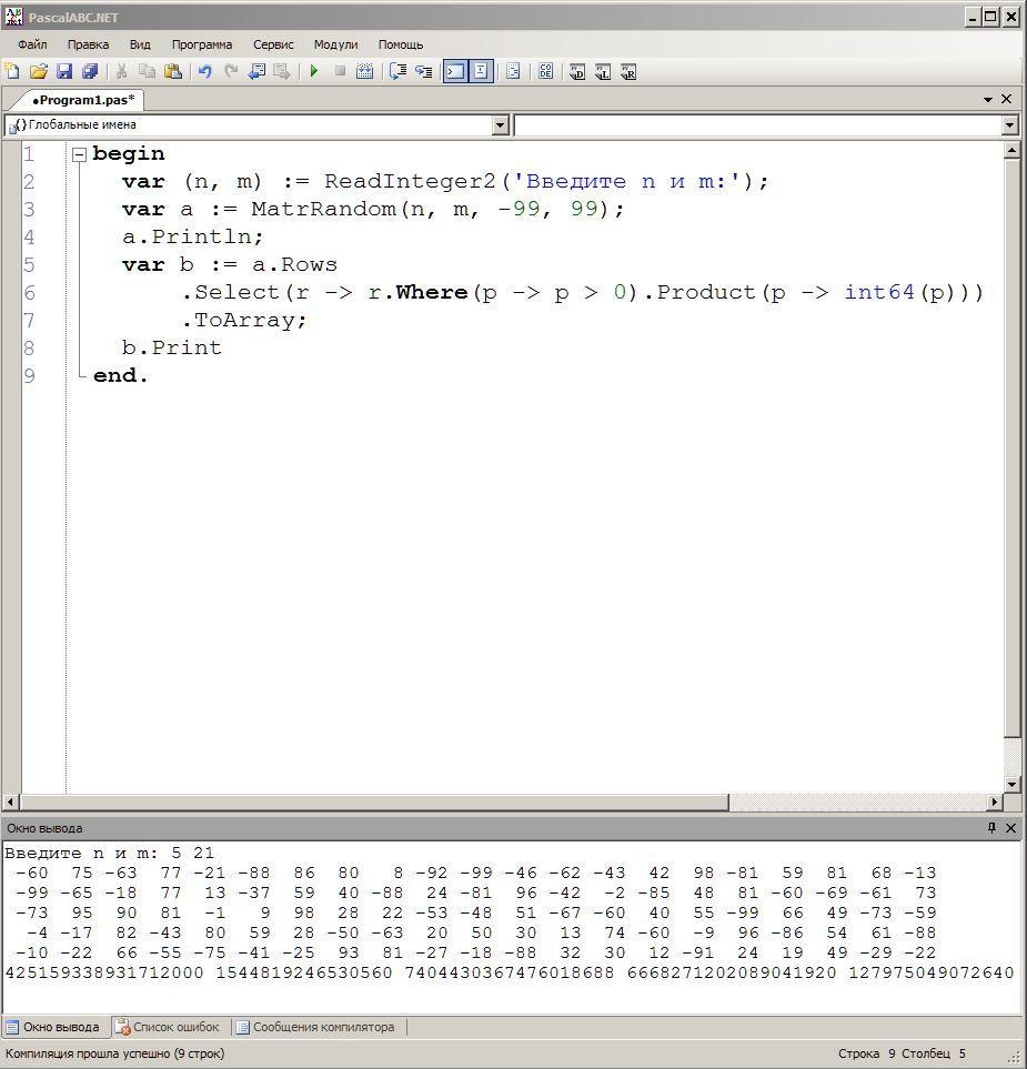 Дана матрица А(n,m). Сформировать массив В(n), каждый элемент которого есть произведение положительных элементов соответствующей строки матрицы А.