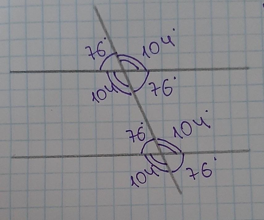 один з кутів,що при перетині двох паралельних прямих січною дорівнює 76 знайдіть градусні міри решти семи кутів