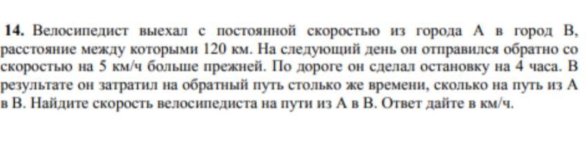Обозначим скорость велосипедиста на пути из A в B через x , тогда его скорость из B в A равна (x + 5) км/ч . Расстояние между городами равно 120 км, значит на путь из A в B велосипедист затратил 120/x часа, а на путь из B в A затратил бы 120/(x + 5) часа. На обратном пути он сделал остановку на 4 часа значит затратил на путь из B в A всего :