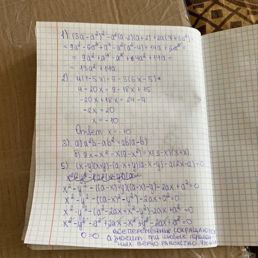 5. Докажите, что при любых значениях переменных верно равенство (х - у) (х + у) - (а - х + у) (а - х - у) - а (2х -а) = 0.