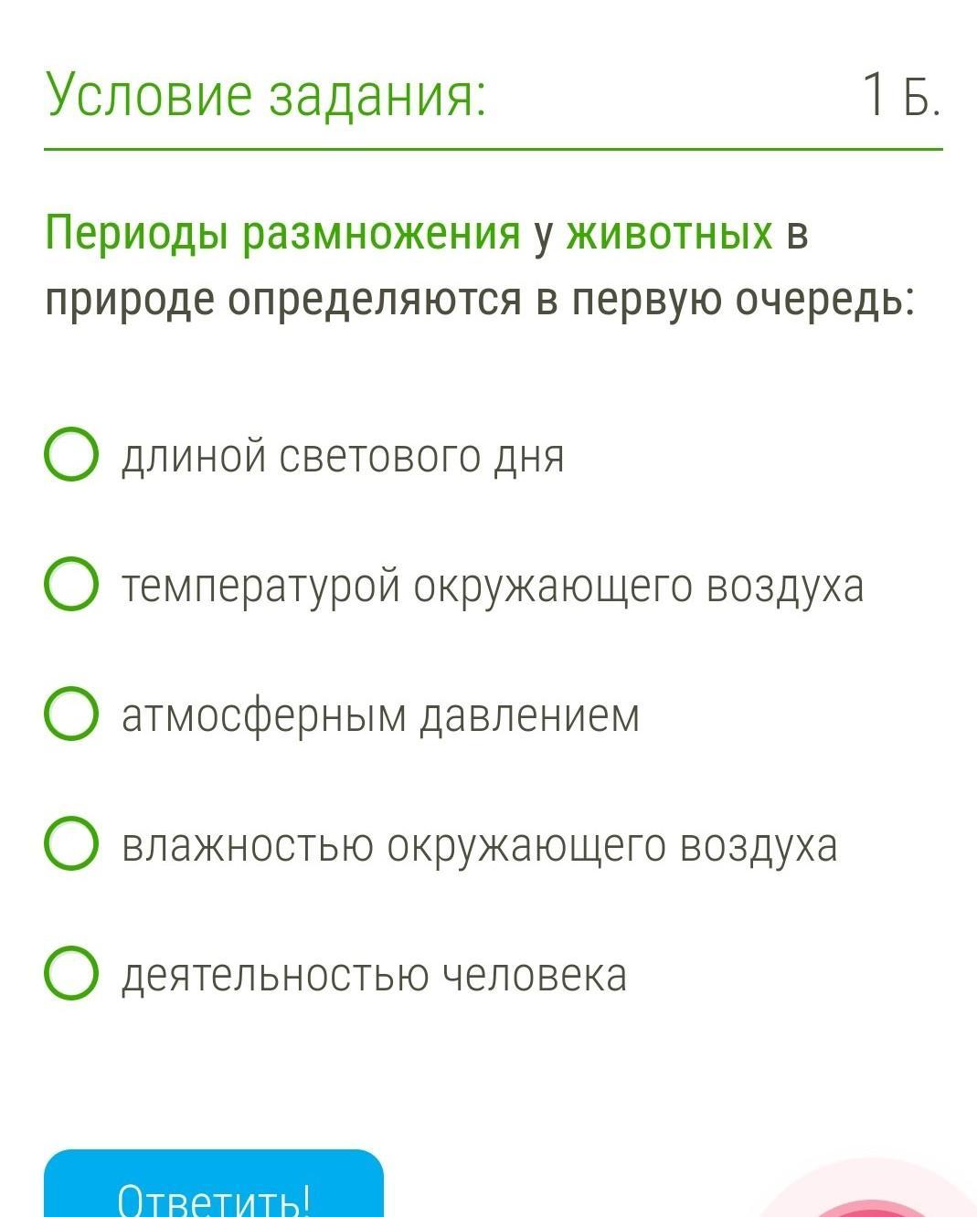 Периоды размножения у животных в природе определяются в первую очередь: длинной светового дня, температурой окружающего воздуха.