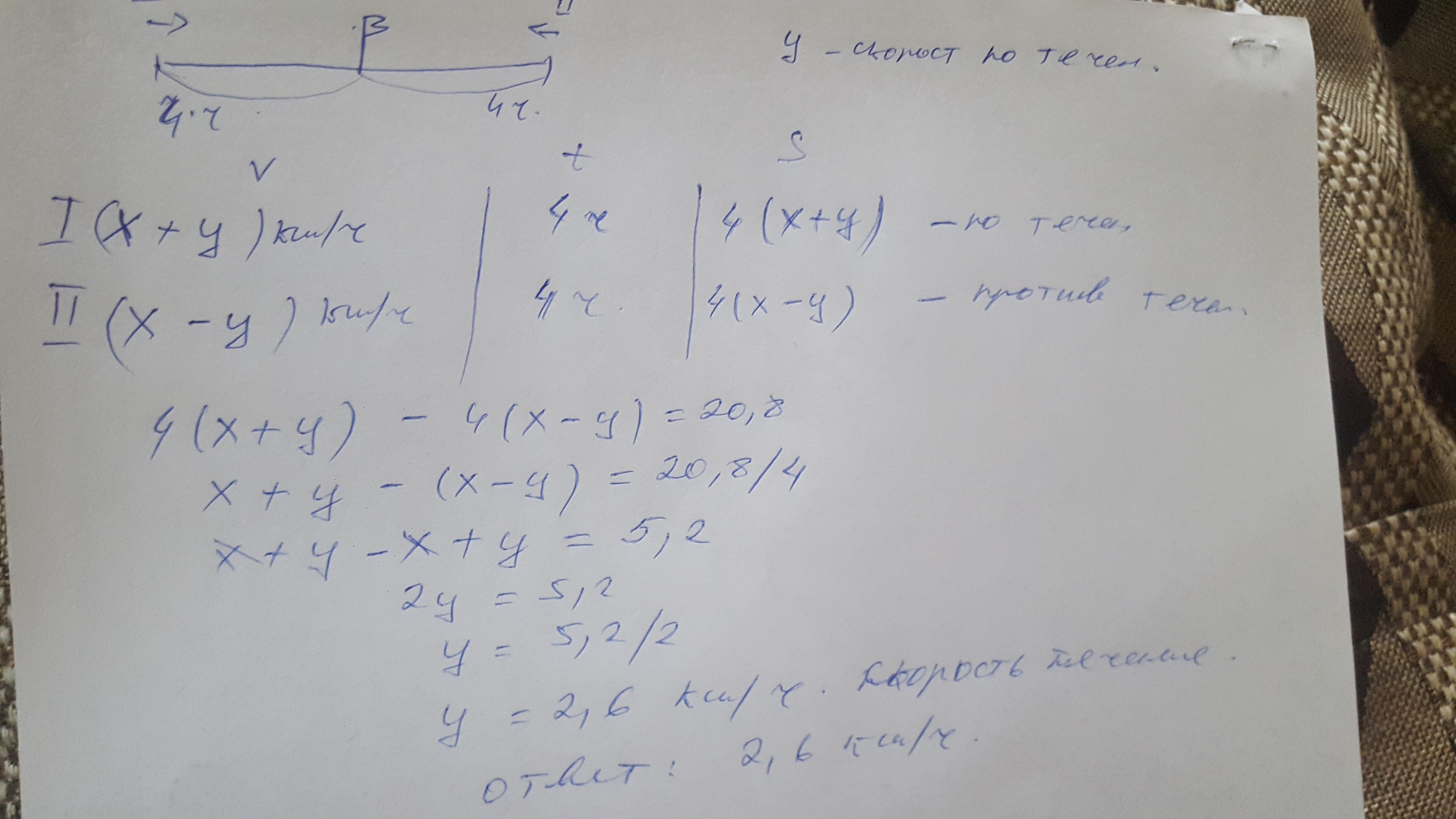 Одновременно от двух пристаней навстречу друг другу отошли две моторные лодки с одинаковыми скоростями. Через 4 ч они встретились. Лодка, которая плыла по течению, прошла на 20,8 км больше, чем другая лодка. Вычисли скрость течения реки.