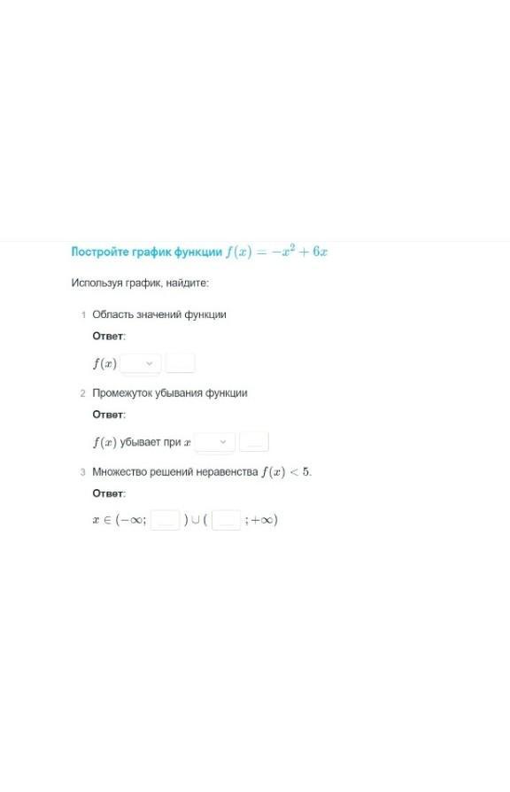 Решение:Это гафик параболы, ветви направлены вниз( зайди на построение графиков онлайн и перерисуй!!!). Вершина параболы в точке (3;9) , с осью ОХ пересекается в точках(0;0) и (6;0)